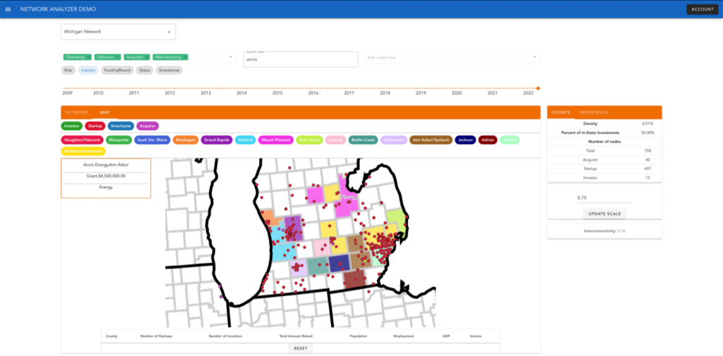 EFN software maps and analyzes businesses in over 60 industry groups and related organizations in a region. The figure below is an example using data for businesses and other organizations in Michigan.
